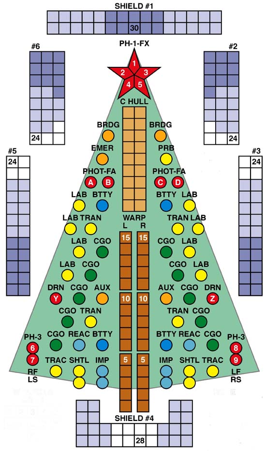 "Auxiliary Control to Bridge. Unknown One is not exhibiting signs of aegis-type scanners or sensors. Their shields appear to be similar to military grade shields, although somewhat weaker than we would expect on a small cruiser or a large destroyer. They have a total warp signature of .625. We classify them as either a large class four or more likely a small class three vessel. Their scanning and targeting systems appear radically different than any we have seen before." "Special team to Bridge. Their shielding frequency and systems appear to be somewhat different than ours; they are not coded for warp synchronization as we would assume normal, there appears to be a compound resonant effect in operation. Weapons fire analysis does not match up to any known signature; we read it as some kind of warp-accelerated delta selenium atomic maser in the W band. The output of each of these delta masers should be somewhat comparable to our primary phasers. It looks like this guy is from far, far away. Or we are." Shawn Hantke asks: If a Klingon D6 and six fast patrol ships dock separately inside a module they take up (7+6=) 13 docking points. A D6P also takes up seven docking points. A tug with pods docked generally does not take up more space with the pods. Does a fast patrol ship tender take up more space with patrol ships docked to it?
