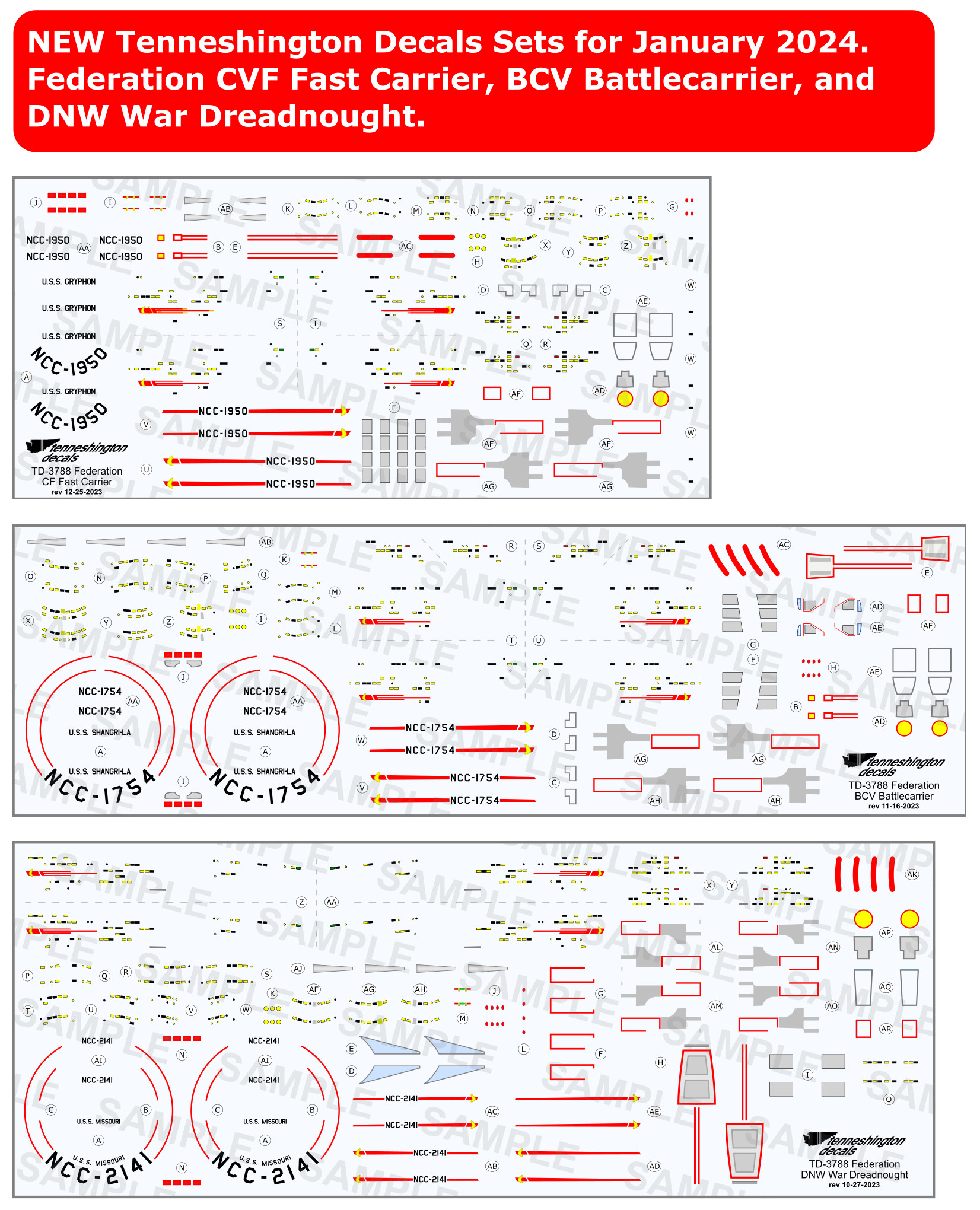 Tenneshington Decals continues to produce decal sets made to fit Federation starships in ADB's Shapeways 3788, 3125, 7000 "Elite", and 2500 "Prestige" scales. A wide selection of ships are available, with sets for the CVo operational ("flatbed") carrier, CVA heavy fleet carrier, CF fast cruiser, and DDF fast destroyer recently added. The 3788 scale decals are also great to use on ADB's metal Starline 2400 ships and the 3125 scale decals can be used on ADB's metal Starline 2500 ships. Tenneshington will also continue to offer their legacy decals for Starline 2500 ships as special orders, for customers wishing to match their existing minis. As with all of their products, the names on the ships are up to the customer and all sheets are custom-printed to order.