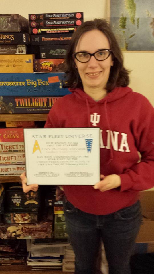 SFB Tactic of the Month STUPID SUBLIGHT TRACTOR TRICKS - Senior Lieutenant Jim Davies, HMS England Using tractors, a pair of sublight ships can go faster than light, if they are both the same size. This requires that they have tractor-1 or better in the Early Years. Consider a pair of allied sublight ships the same size, A and B, in the same hex. Ship A tractors ship B and moves Speed 1, while ship B does not move. They both move on Impulse #32. Ship A maintains the tractor over the turn break and uses tractor rotation to push ship B forward one hex. On the next turn, ship A drops the tractor, and ship B tractors ship A, pulling it forward by rotation at the start of the third turn after both ships move on Impulse #32 of Turn #2. Rinse and repeat as required. Ideally this will all be done by reserve power on Impulse #31 to allow flexibility and remove the restrictions of (G7.9). Given enough tractors, this works for groups of any size, and takes a constant one point of energy per ship per hex. Half of this pseudo-movement power (the tractor link and rotation) can even come from an APR and can go in all sorts of directions, not only forward. (End of SFB Tactic of the Month) It is always nice to see someone enjoying a gift! You can show someone how much you really love them by naming a starship in the Star Fleet Universe after her! You can name starships for any or all of the women in your life: your mother, daughter, sister, cousin, or the secret object of your admiration! For only $5.00 we will name a Federation Star Fleet auxiliary cruiser after your lady friend (or male friend). Click here to name a starship.