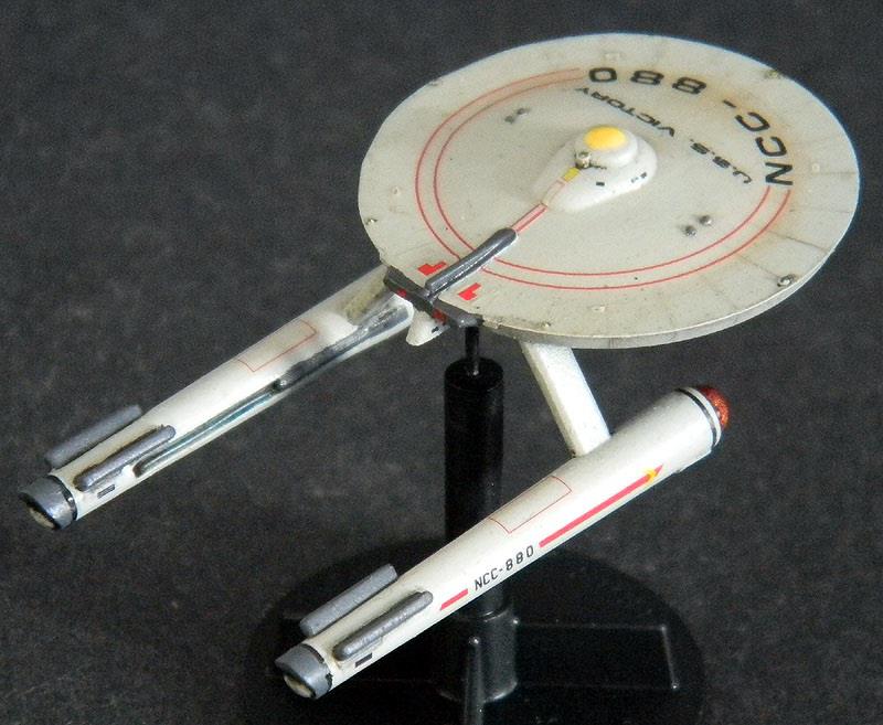 Have another ship tractor your target and drag it into your heavy weapons firing arc! This, however, takes some advanced planning and positioning. You have to think a turn ahead to put the ship you need where you're going to need it, without the enemy realizing what you're doing. Ideally you want a ship that is significantly larger than the ship to be dragged (e.g., a Federation heavy cruiser versus Klingon D7 or D5). During the dragging ship's activation, which should be after the target ship has moved, have it use the Engage Tractor Beam! special action. Next, end your ship's movement within two inches of the ship to be tractored. The following turn, the tractored ship may roll to break the tractor when it is activated. It does this by making an opposed Crew Quality Check against the ship tractoring it. [See the rules for this procedure]. If the tractored ship fails to break free, it is meat on the table. Drag it in front of the ship that intends to fire at it or drag it to a point that the designated killer ship can get it into arc. Remember that you can only move if you have more starting damage points than the enemy ship, and you can only move up to six inches. As a final warning, be careful to not blow up the ship that was dragged, as the explosion can damage friendly ships - including the ship doing the tractoring. Also try to arrange your positioning so that the tractored ship cannot fire its heavy weapons at the ship that is tractoring it. Mini of the Month Jim Lewis writes: USS Victory is a Franz Joseph-style escort frigate for my command cruiser USS Balson. Super-easy mini to model, with a trimmed down dorsal neck housing engineering space and a phaser-1 mount for the rear arc. Photo by Jim Lewis.