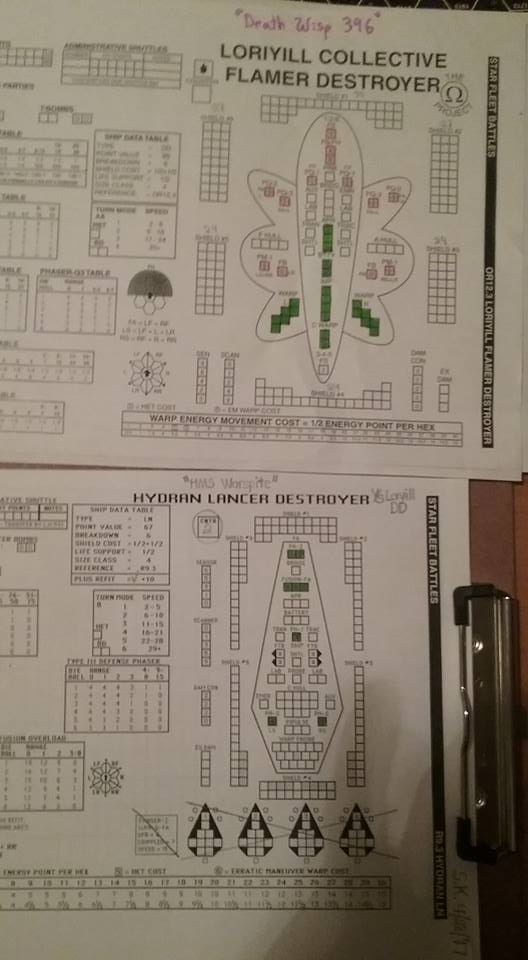 Facebook Highlight of the Month Sidney Kanouse reports: Battle Report: My Granddaughter flew a Loryill DD. I flew a refitted Hydran Lancer DD without fighters. We made four battle passes, lots of turning and burning. She had the advantage after Turn #3. The last pass we mutually gutted each other. Glorious battle that resulted in a Taco Bell run. Good times. Next fight she'll be ready for a heavy cruiser.