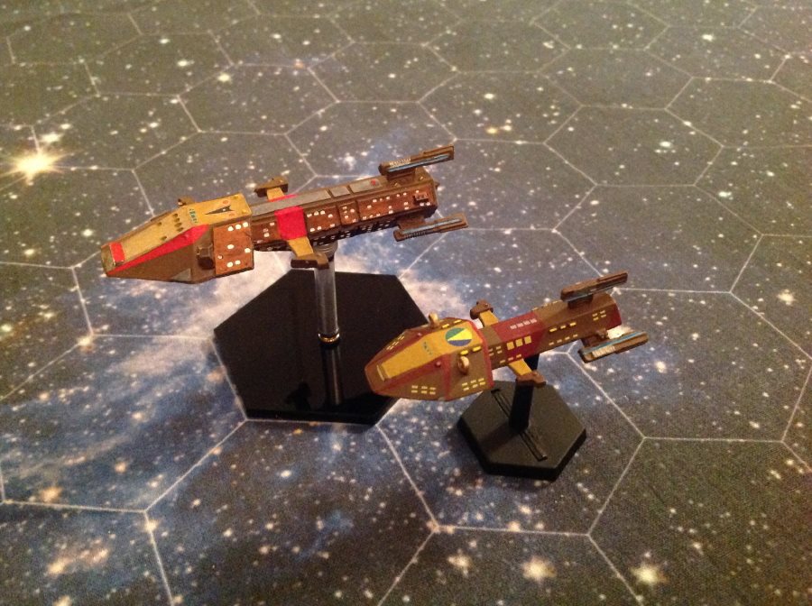 End of the game. Damaged Fed heavy cruiser withdraws (foreground) while Fed battlecruiser draws off the Klingon C7 heavy battlecruiser and turns in a futile effort to try to save the light cruiser.