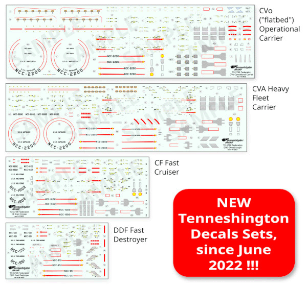 Tenneshington Decals continues to produce decal sets made to fit Federation starships in ADB's Shapeways 3788, 3125, 7000 "Elite", and 2500 "Prestige" scales. A wide selection of ships are available, with sets for the CVo operational ("flatbed") carrier, CVA heavy fleet carrier, CF fast cruiser, and DDF fast destroyer recently added. The 3788 scale decals are also great to use on ADB's metal Starline 2400 ships and the 3125 scale decals can be used on ADB's metal Starline 2500 ships. Tenneshington will also continue to offer their legacy decals for Starline 2500 ships as special orders, for customers wishing to match their existing minis. As with all of their products, the names on the ships are up to the customer and all sheets are custom-printed to order. Additional decal sets are available for shuttlecraft and to sets to detail any ship with additional window blocks, sensors, hatches, and even phaser scars. For more information or to download the order sheet, check them out at www.tenneshington.com. Or if you prefer, email Will McCammon at: will@tenneshington.com or Tony L. Thomas at: scoutdad@tenneshington.com .