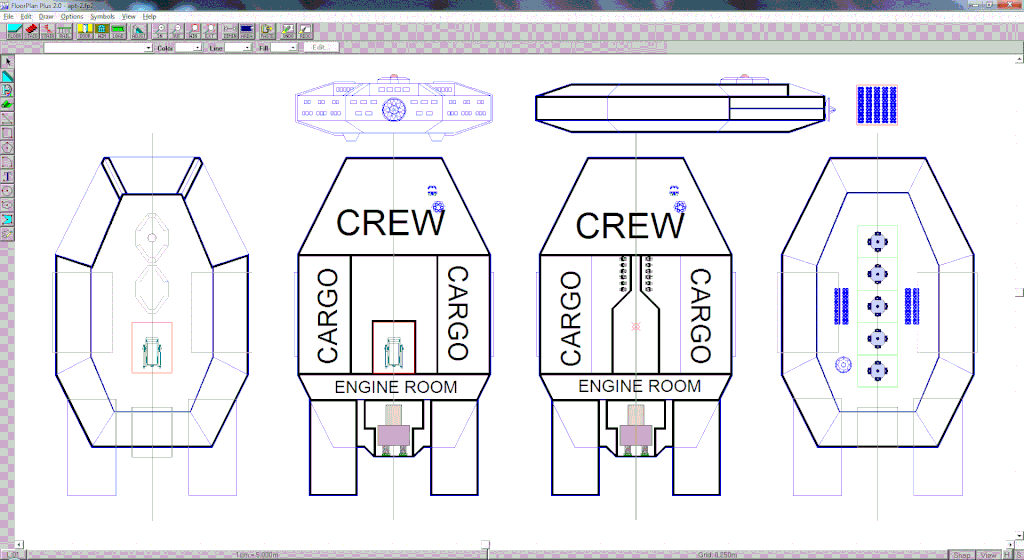 One question: how much detail do you think I should put in? If you look at the plans Nick Blank did, he simply put labels in the rooms for what they are. When I did the Police Cutter plans, I put in every bed, chair, desk, and what-have-you. I mapped out one room to make sure I had enough room, and after that it was a simple copy-&-paste, albeit pasting about a hundred times over. Just as easy for me to do here. What do you all think??