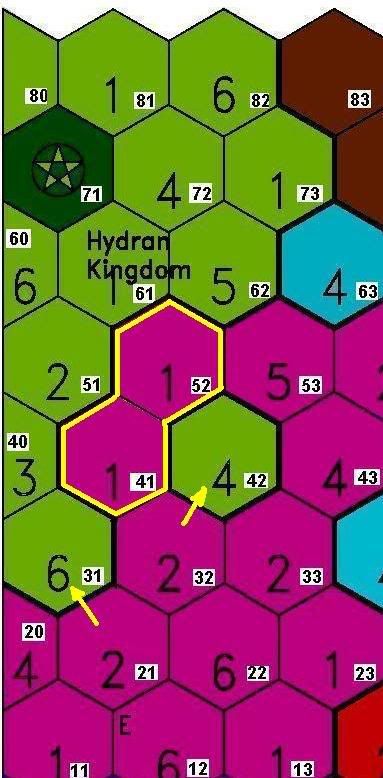 Here also is a map close up of the currant Hydran/Kzinti fights still to be finished for this turn. The 2 hexes with the yellow border are the ones the Kzinti took with out a fight and the arrows show the Kzinti attacks still to be fought.